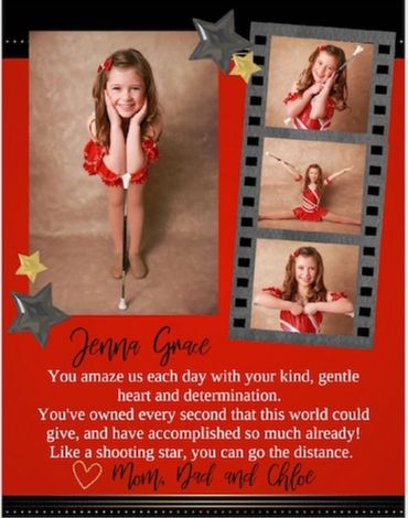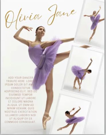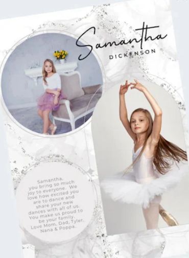 Let us know which size ad you’d like. We’ll take your personalized note and photos of your dancer to design a custom ad and send you a proof to review. Ads will go in our year-end performance programs. There are several layouts to choose from.